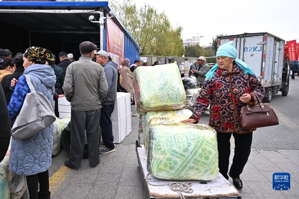 11月8日,在中哈霍爾果斯國際邊境合作中心,哈薩克斯坦的游客將購買(mǎi)的貨物打包發(fā)車(chē)。