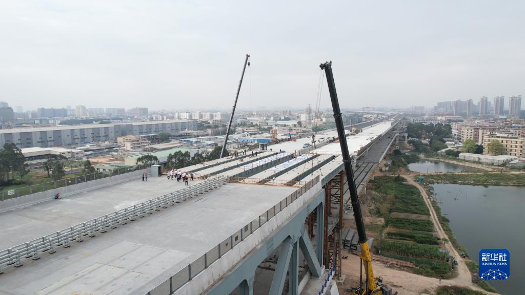 11月10日,莞番高速公路最后一段鋼箱梁吊裝完成(無(wú)人機照片)。