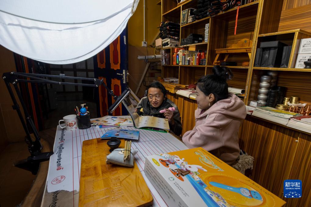 西藏拓崗文化傳播有限公司員工拉巴頓珠(左)與主播索朗德吉合作直播銷(xiāo)售藏語(yǔ)學(xué)習文具(11月10日攝)。