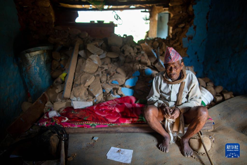 11月6日,一名男子坐在尼泊爾西部扎澤爾果德地震災區的建筑物廢墟內。