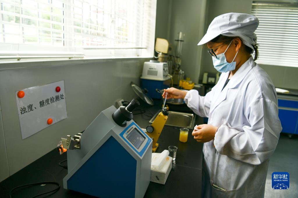 貴州省龍里縣高新技術(shù)產(chǎn)業(yè)園區一家刺梨加工企業(yè)的員工檢查刺梨的濁度和糖度(2021年8月19日攝)。