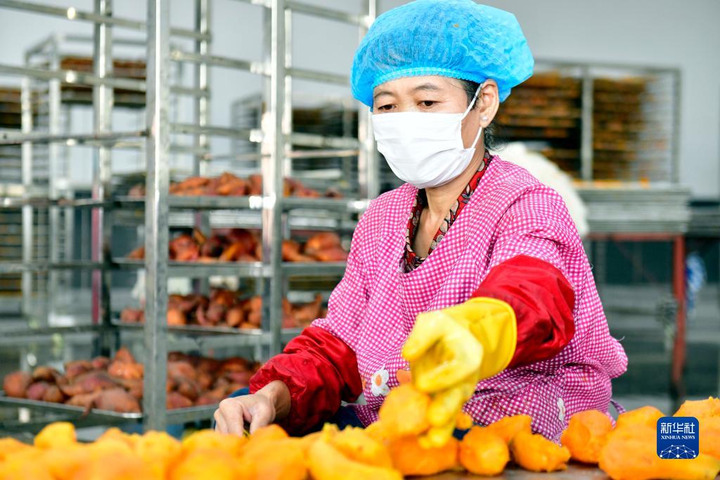 11月11日,在五蓮縣潮河鎮魏家薯干專(zhuān)業(yè)合作社,工作人員在加工薯干。