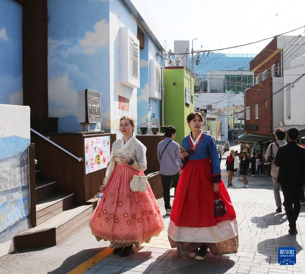 11月9日,游客在韓國釜山市的甘川文化村游玩。