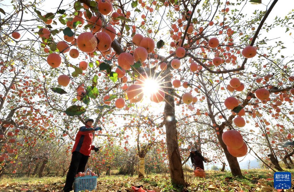 11月4日,在河北省平山縣孟家莊鎮元坊村,農民在蘋(píng)果種植基地采收蘋(píng)果。