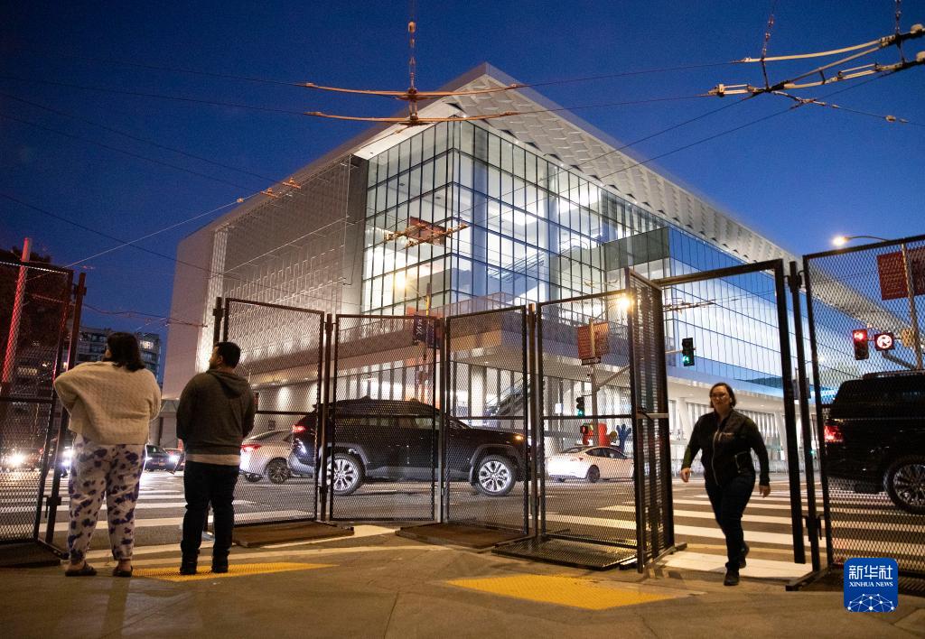 11月10日,在美國舊金山,亞太經(jīng)合組織會(huì )議場(chǎng)地外豎起金屬?lài)鷻凇?/p>
