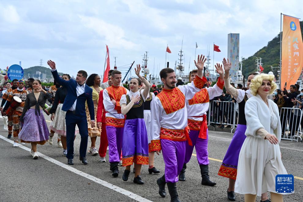 11月11日,外國民間藝術(shù)表演團隊在浙江省舟山市參加第八屆沈家門(mén)漁港民間民俗大會(huì )開(kāi)幕式巡游展演。