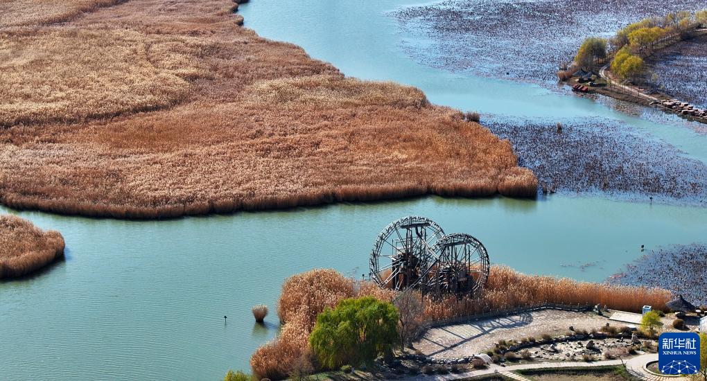 立冬節氣過(guò)后,位于寧夏銀川市興慶區的鳴翠湖國家濕地公園,金黃色的蘆葦隨風(fēng)飄蕩,各色林木五彩斑斕,構成獨特的初冬濕地景觀(guān)。