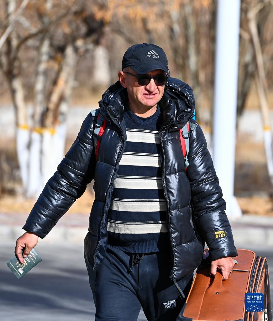 出境旅客攜帶行李和護照前往新疆紅其拉甫口岸聯(lián)檢大廳(11月6日攝)。