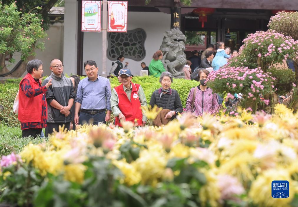 11月12日,“市民園長(cháng)”陳素芬(左一)在福州西湖公園與市園林中心、西湖公園管理處管理人員交流游客參觀(guān)西湖菊花展覽評價(jià)等情況。