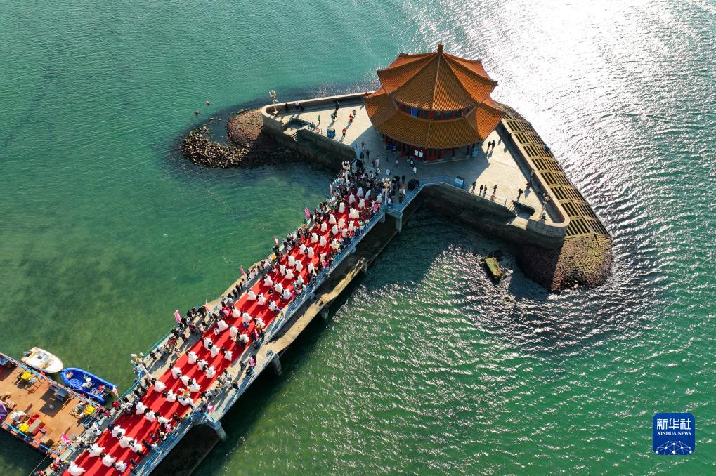 11月12日,在山東省青島市棧橋回瀾閣前,新人參加集體婚禮(無(wú)人機照片)。