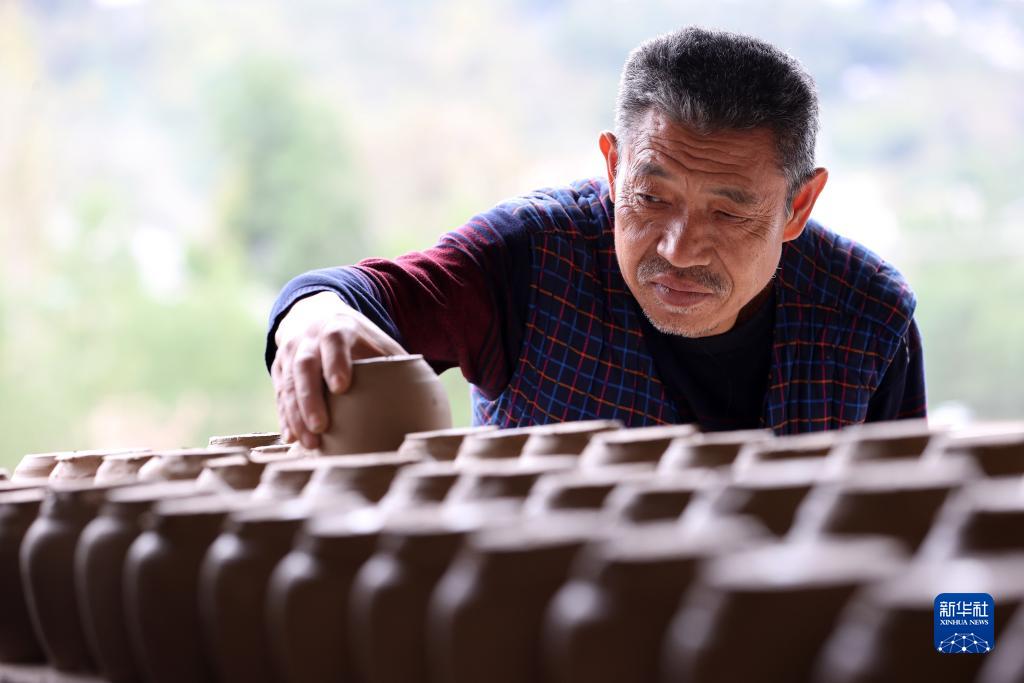 11月11日,在重慶市黔江區濯水鎮石雞坨土陶非遺工坊,工人檢查陶坯的干濕度。