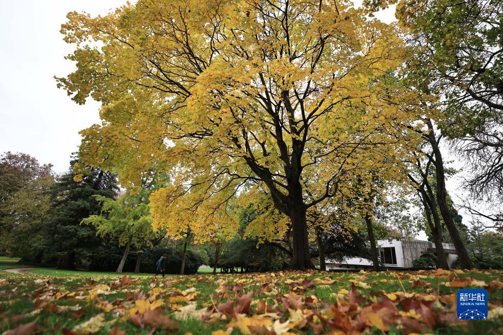 這是11月12日在法國巴黎蒙蘇里公園拍攝的鋪滿(mǎn)落葉的草地。