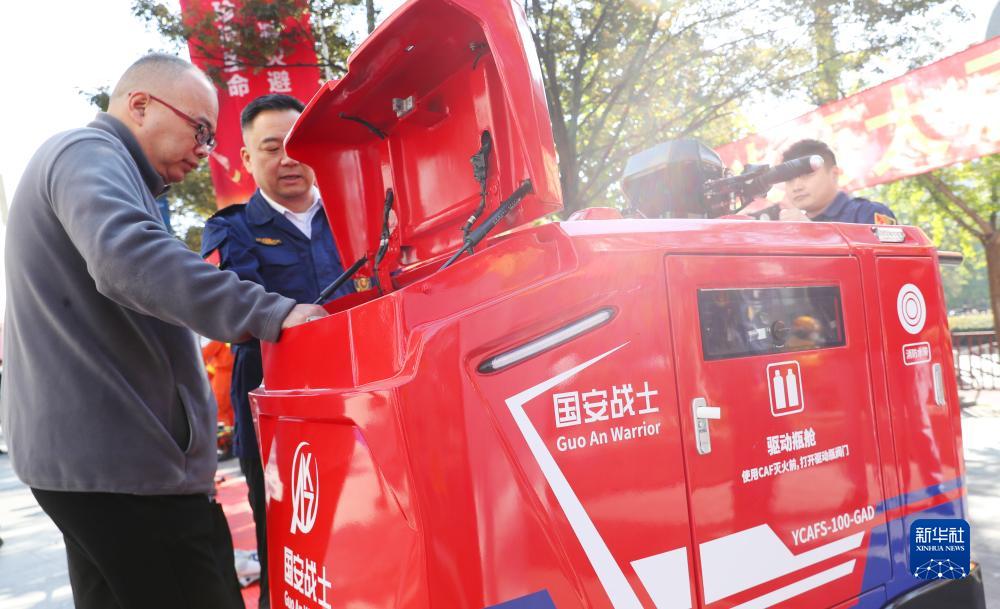 11月13日,市民(左)在向工作人員了解一個(gè)微型移動(dòng)式滅火裝置的操作方式。