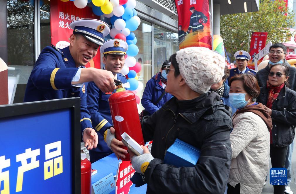 11月13日,消防宣傳工作人員將現場(chǎng)展示的一支滅火器送給參觀(guān)的市民。