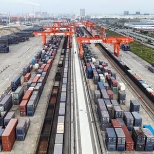 火車(chē)在欽州港碼頭裝運集裝箱(11月12日攝,無(wú)人機照片)。