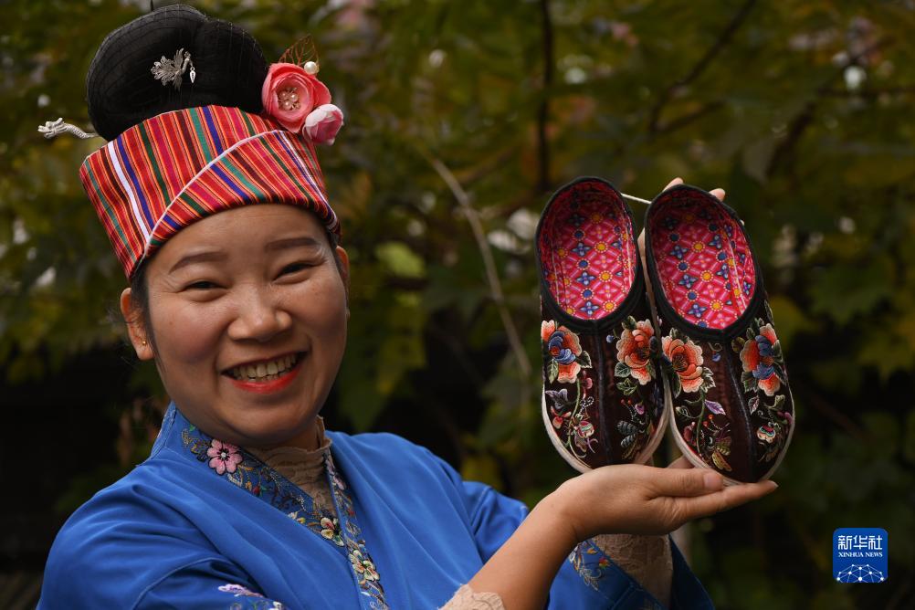 11月13日,苗族婦女在貴州省黔東南苗族侗族自治州施秉縣的一家苗繡作坊里展示苗族繡花鞋。