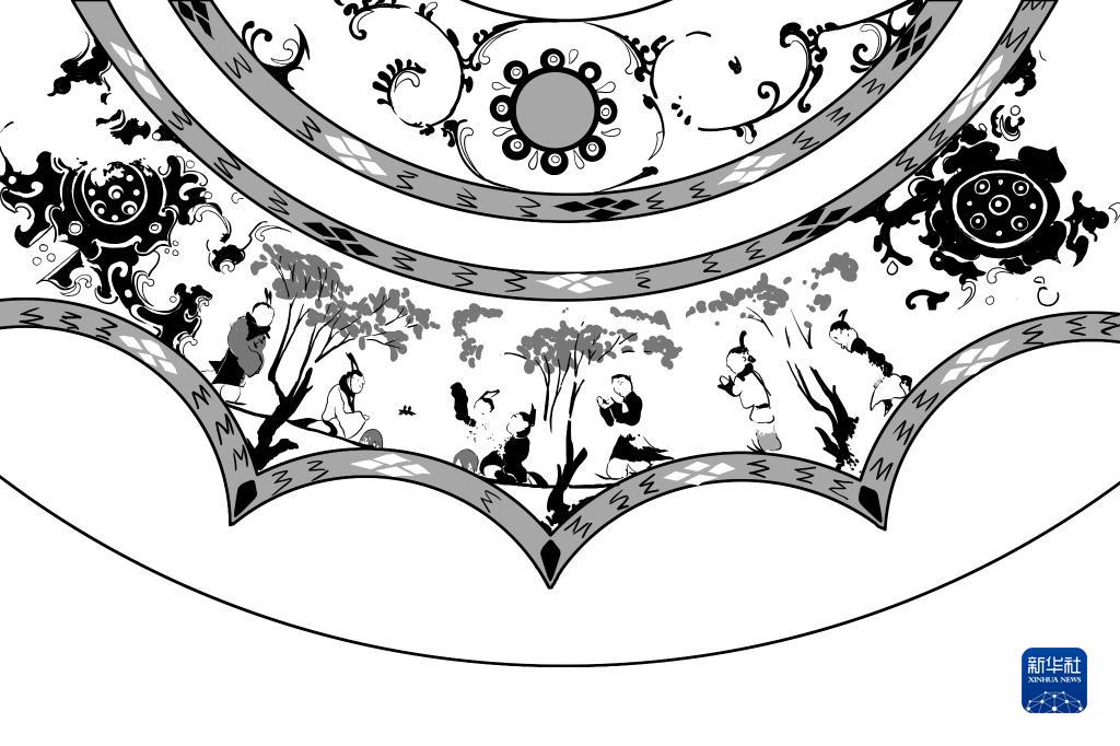 西漢彩繪人物車(chē)馬鏡局部“宴飲”圖案線(xiàn)稿圖。新華社發(fā) 李賀 繪制
