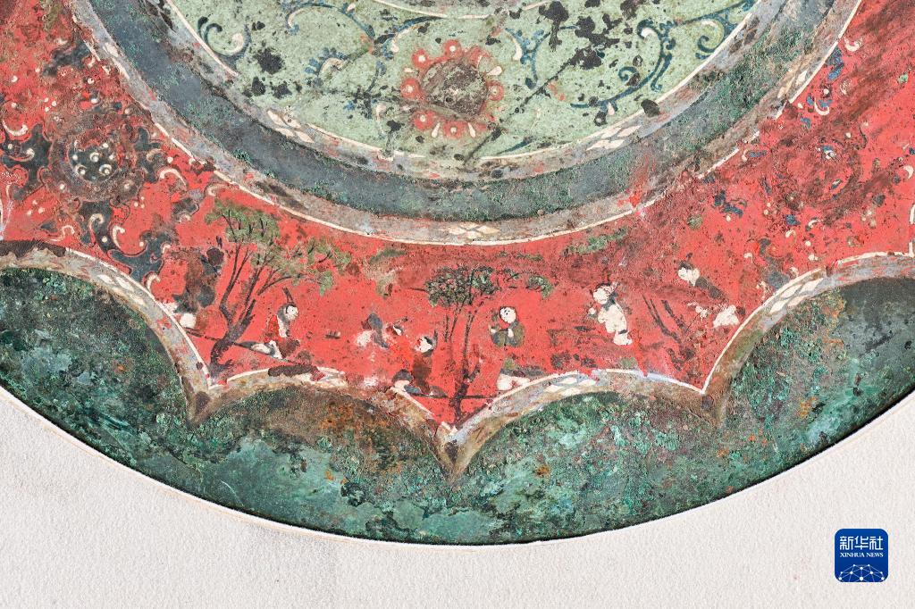 西漢彩繪人物車(chē)馬鏡局部彩繪圖案“宴飲”(8月25日攝)。新華社記者 李賀 攝
