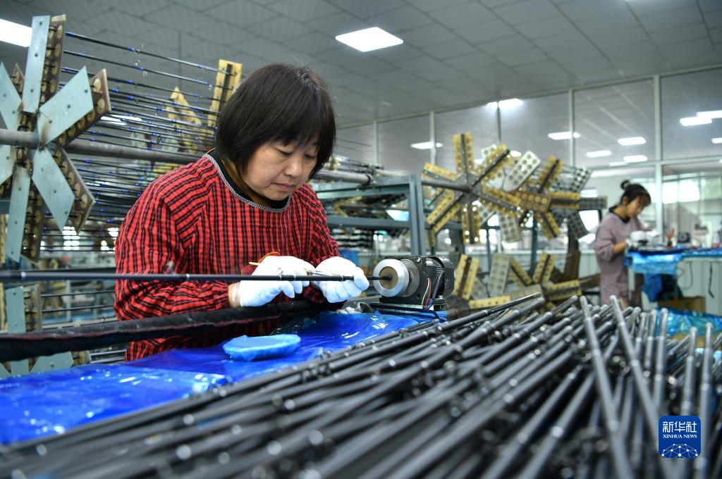 11月14日,河北省肅寧縣一家魚(yú)竿漁具生產(chǎn)企業(yè)的工人在車(chē)間內工作。