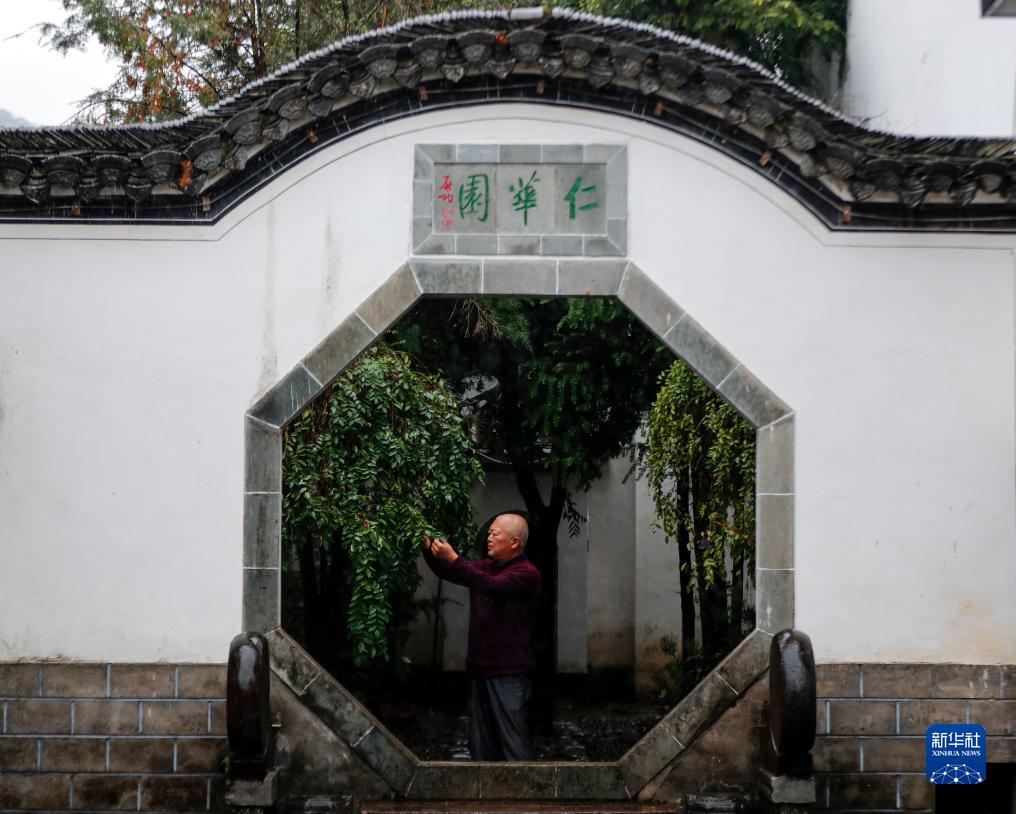11月9日,在安徽省黃山市歙縣深渡鎮定潭村新安國醫博物館,李梃查看藥用植物生長(cháng)情況。