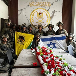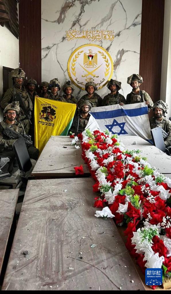 這張以色列媒體11月14日刊發(fā)的照片顯示,以色列國防軍士兵在加沙城巴勒斯坦伊斯蘭抵抗運動(dòng)(哈馬斯)憲兵總部舉著(zhù)以色列國旗。