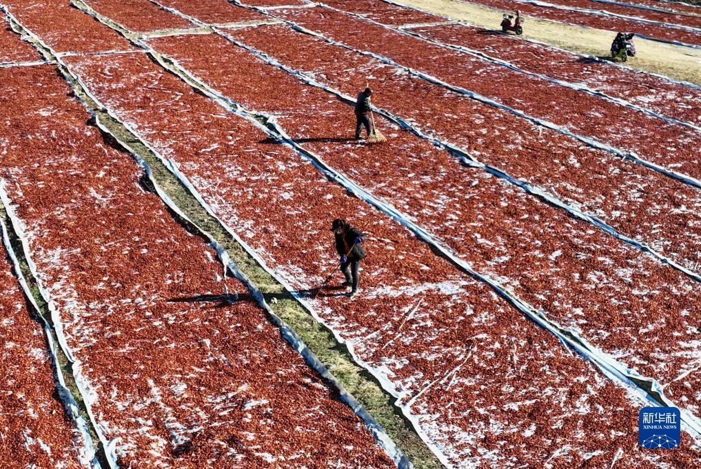 11月14日,河北省遵化市侯家寨鎮的農民在晾曬用于中藥材的山楂片(無(wú)人機照片)。