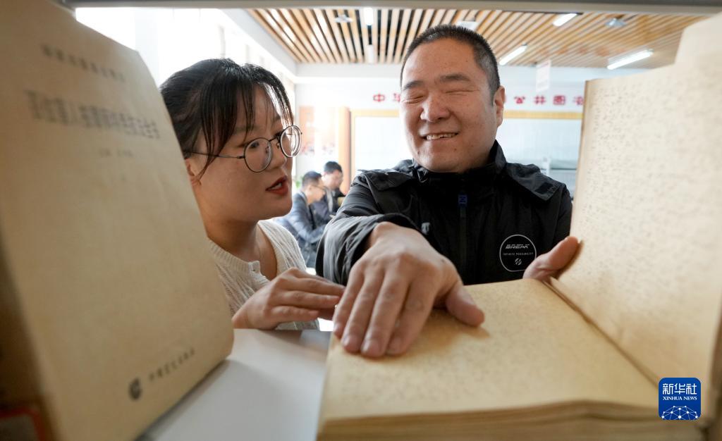 11月14日,在內蒙古烏拉特前旗圖書(shū)館視障閱覽室內,工作人員(左一)幫助視障人士挑選書(shū)籍。