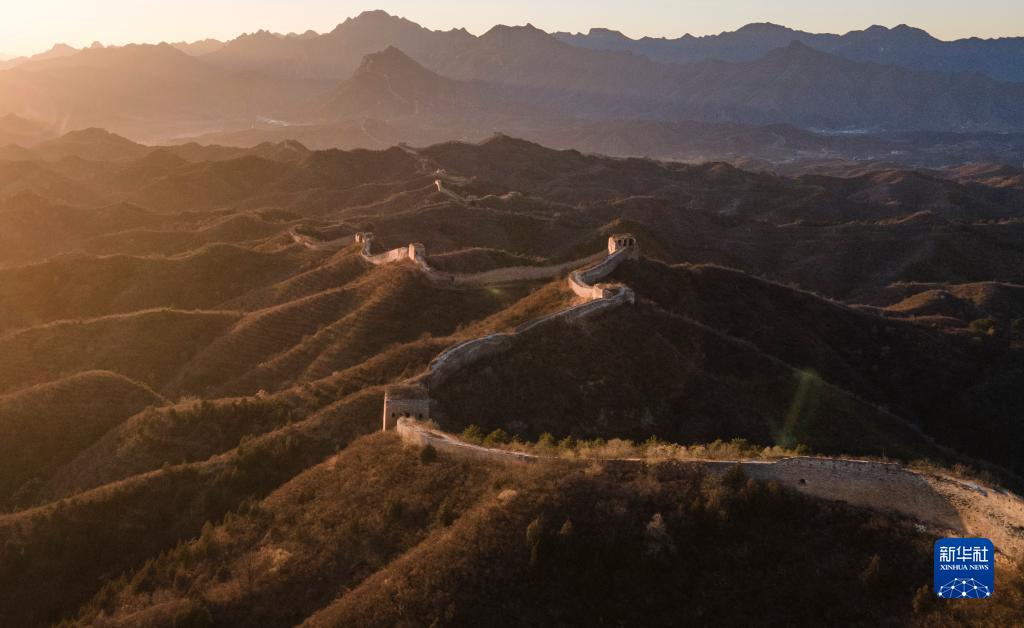 這是11月14日拍攝的夕陽(yáng)下的古北口長(cháng)城蟠龍山段(無(wú)人機照片)。