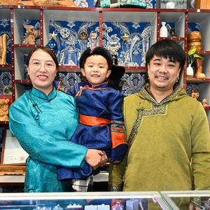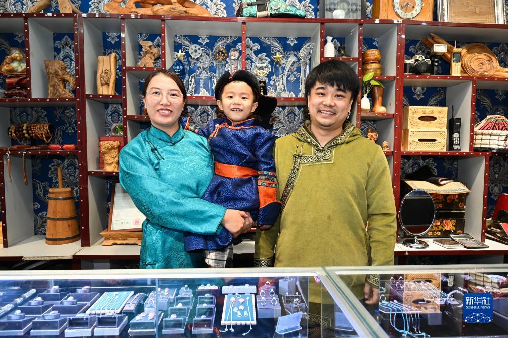 11月14日,在內蒙古烏拉特前旗禾蘇格爾銀匠店內,齊天賜(右)與愛(ài)人蘇曉霞和兒子合影。