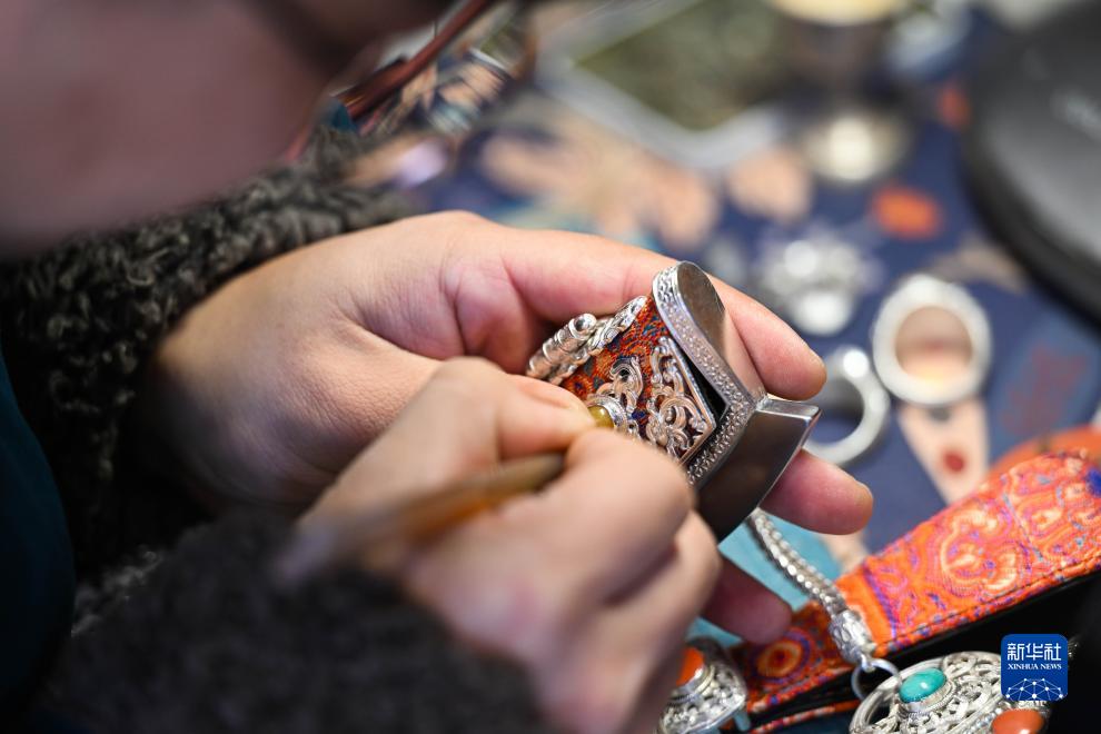 1994年出生于內蒙古烏拉特前旗的齊天賜,天生患有肢體殘疾。雖然命運坎坷,但他不屈不撓。為了學(xué)習蒙古族傳統手工銀飾技藝,他先后跟隨多名非遺傳承人學(xué)習熔銀、鍛打、焊接、清洗等銀飾加工工藝。