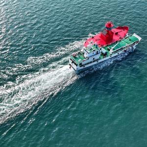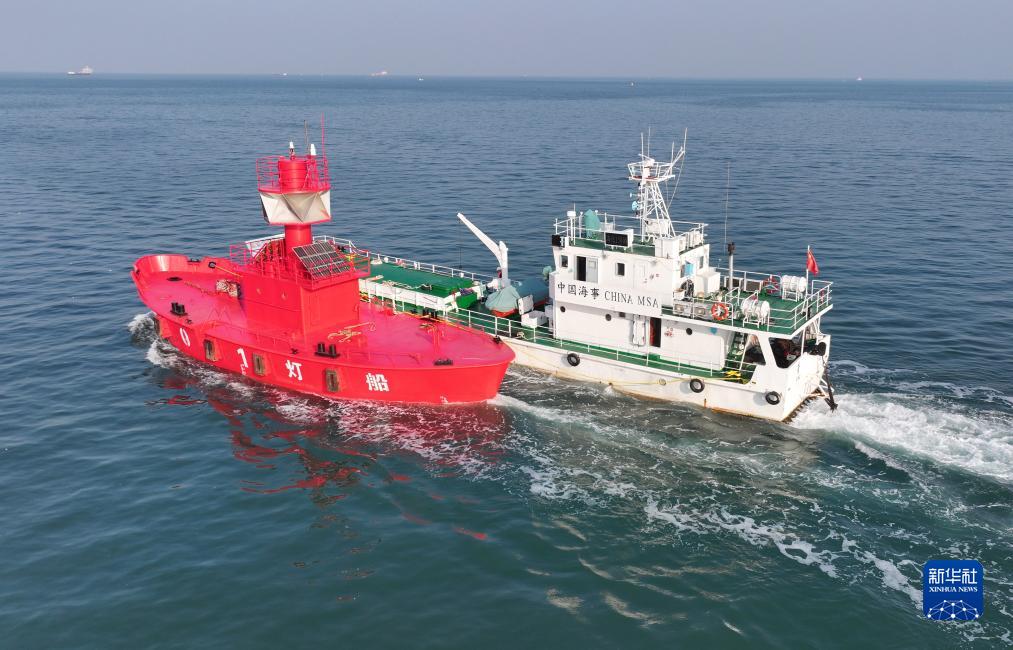 11月15日,青島航標處一艘工作船將新的航標燈船送往作業(yè)海域(無(wú)人機照片)。