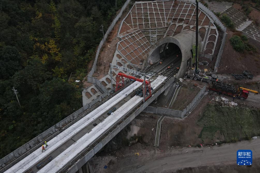 11月16日無(wú)人機拍攝的杭衢鐵路(建衢段)天池山隧道進(jìn)口,隧道無(wú)砟軌道澆筑已完成。