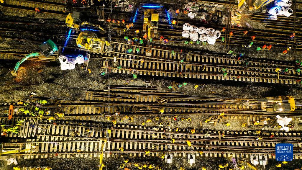 11月15日夜間,在濟南火車(chē)站,中鐵十局的工作人員正在對濟鄭高鐵引入濟南站進(jìn)行站改作業(yè)(無(wú)人機照片)。