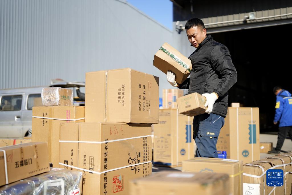 11月16日,在位于唐山市豐潤區的唐山公路港物流有限公司,工人在搬運快遞商品。
