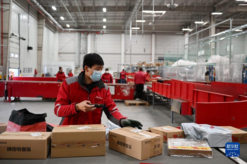 11月16日,在普洛斯唐山豐潤物流園,京東物流的工作人員在發(fā)送商品。