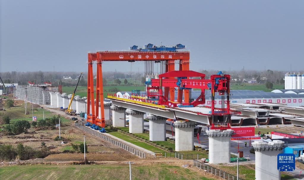這是中鐵四局阜淮鐵路全線(xiàn)首榀箱梁架設現場(chǎng)(11月16日,無(wú)人機照片)。