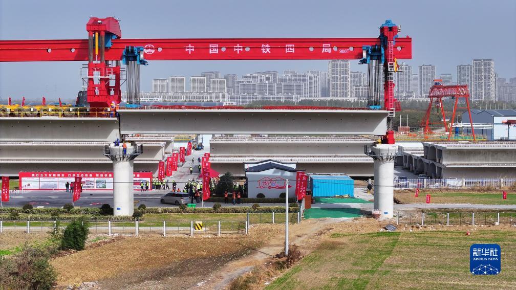 這是中鐵四局阜淮鐵路全線(xiàn)首榀箱梁架設現場(chǎng)(11月16日,無(wú)人機照片)。