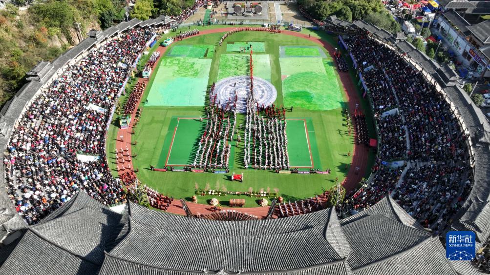 11月16日,在雷山縣民族文化活動(dòng)中心,苗族同胞身著(zhù)盛裝,載歌載舞歡慶苗年和鼓藏節(無(wú)人機照片)。