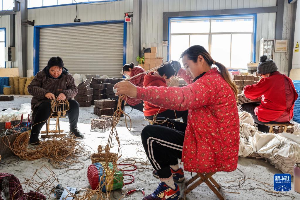 11月16日,東平縣老湖鎮水滸安置社區居民在手作加工點(diǎn)加工藤編產(chǎn)品。