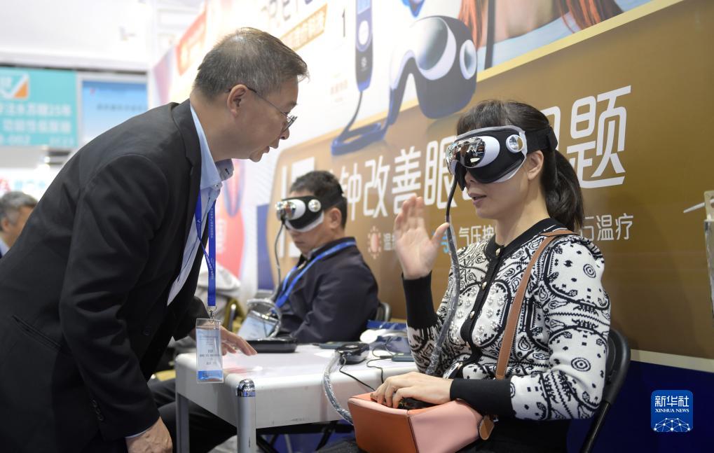 11月17日,觀(guān)眾在展會(huì )上體驗一款眼部護理儀。