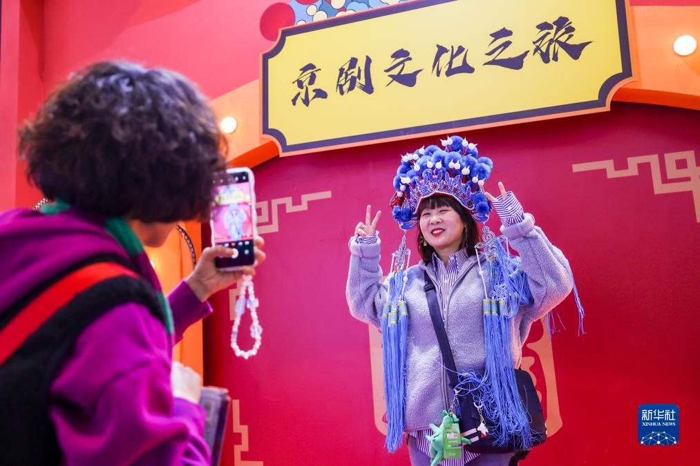 11月17日,參觀(guān)者在2023中國國際旅游交易會(huì )北京展區體驗佩戴京劇頭飾。
