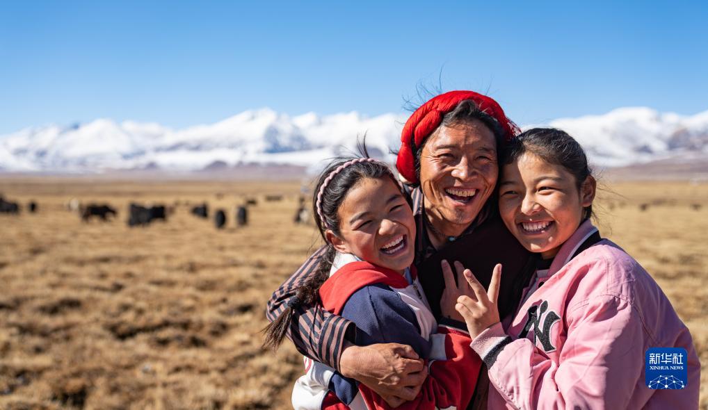斯曲卓瑪(右)和爸爸、妹妹一起在草原上放牧間隙(11月15日攝)。