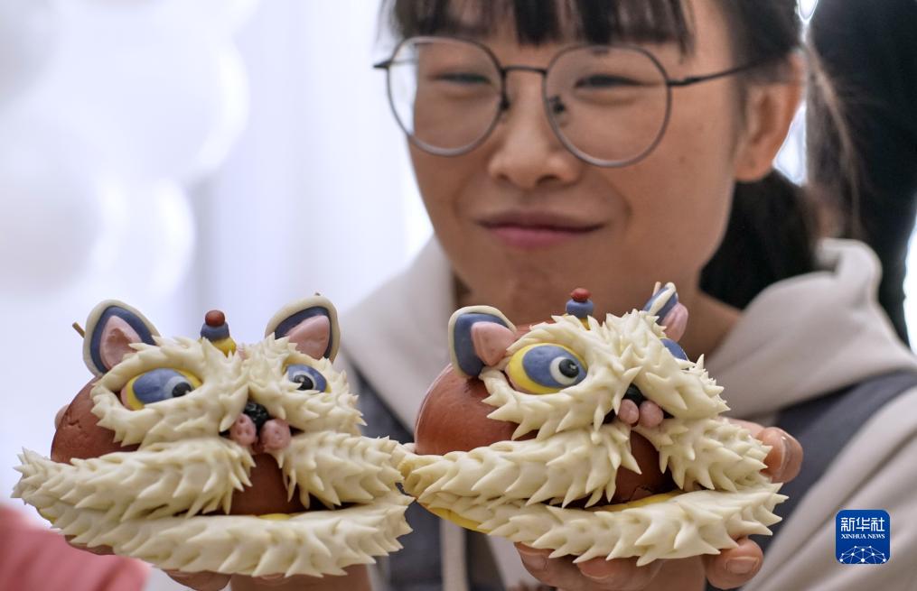 田曉展示她制作的面花作品《醒獅》(11月12日攝)。