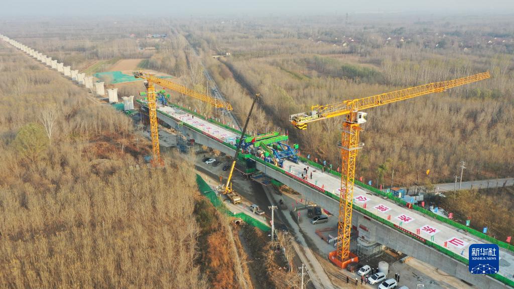 11月20日,在濟濱高鐵商惠濱2號特大橋,山東路橋集團的工作人員在進(jìn)行橋梁合龍作業(yè)(無(wú)人機照片)。