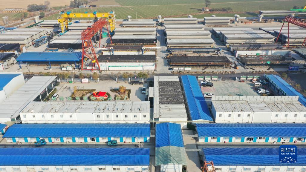 11月21日拍攝的濟濱高鐵山東路橋集團惠民制梁場(chǎng)箱梁加工現場(chǎng)(無(wú)人機照片)。