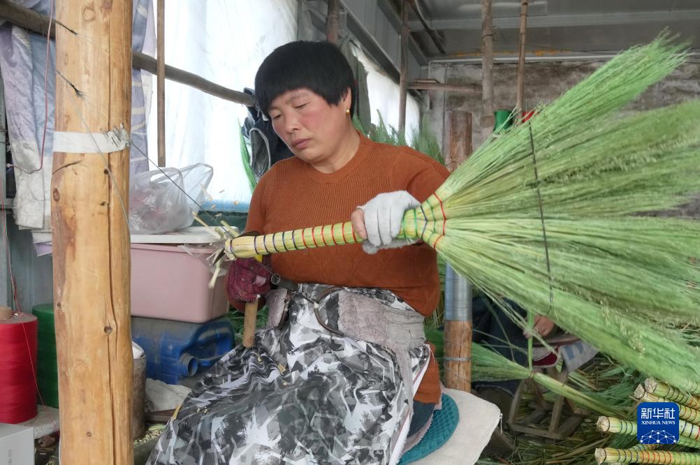 11月21日,河北省樂(lè )亭縣毛莊鎮一家笤帚專(zhuān)業(yè)合作社的社員在制作笤帚。