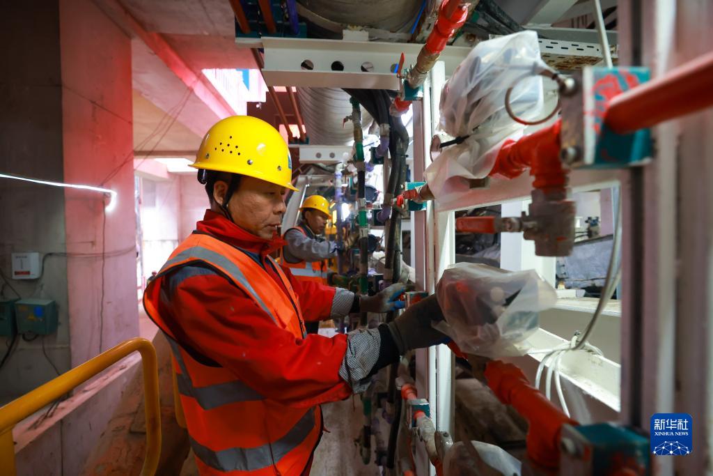 11月21日,來(lái)自中建八局的工程施工人員在作業(yè)場(chǎng)所對盾構機運行進(jìn)行維護監測。
