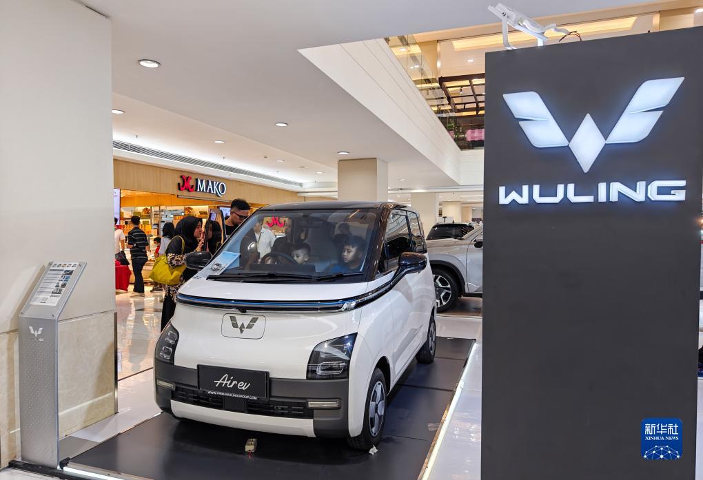 10月1日,在印度尼西亞雅加達一家商場(chǎng),人們在體驗一輛五菱新能源車(chē)Air ev(手機照片)。新華社記者 徐欽 攝