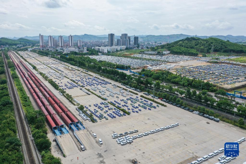 這是位于廣西柳州市的雒容汽車(chē)物流基地,一些出口的新能源汽車(chē)從這里裝車(chē)運往各大出海港口(7月19日攝,無(wú)人機照片)。新華社記者 曹祎銘 攝