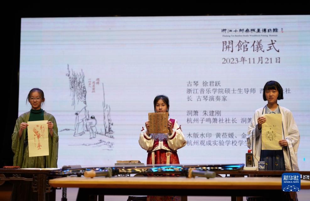 11月21日,杭州觀(guān)成實(shí)驗學(xué)校學(xué)生在開(kāi)館儀式現場(chǎng)進(jìn)行木版水印展演。